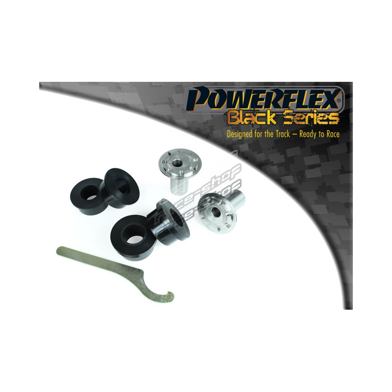 Products Notes: This bush features a CNC machined Stainless Steel sleeve with an offset bore that can be rotated using our bespoke tooling (supplied), giving +/- 0.5 degrees of on-car camber adjustment. For the smaller 30mm bush, please use part no. PFF85-201GBLK. CNC machined stainless steel sleeve with knurled end pattern to prevent unwanted rotation.Rotate to adjust camber.
