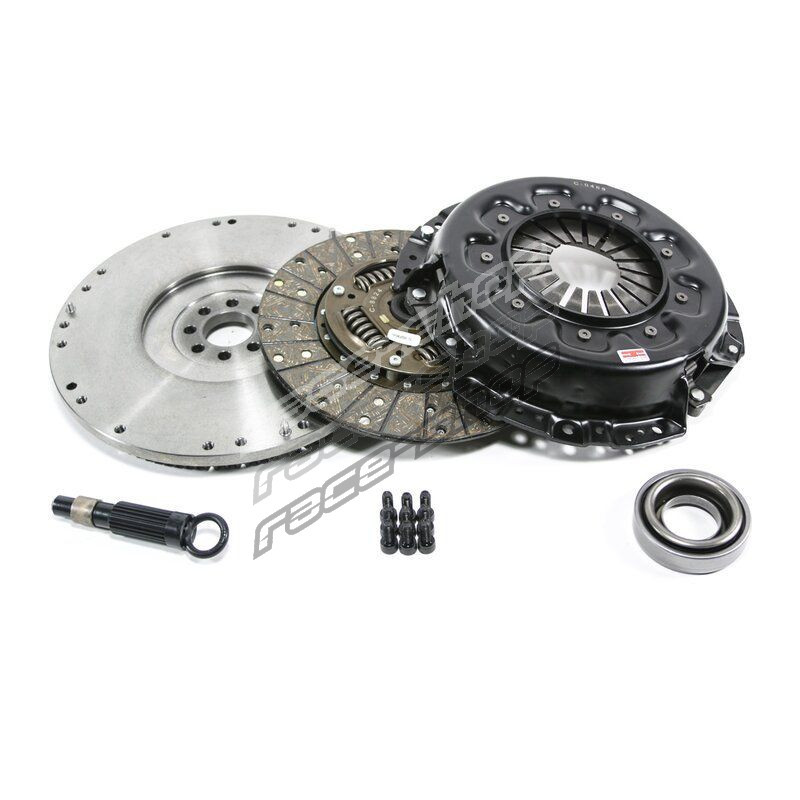 this kit is competition clutch’s specific upgrade for the sr20det 5 speed engine. it comes with a clutch kit (pressure plate, disc, pilot bushing, alignment tool) and a flywheel.the clutch kit uses an oem style 250mm pressure plate, full faced oem style sprung disc and a lightened flywheel that enhances the engine revs. together the kit is stated to withstand about 400 horsepower. the flywhweel weighs about 18 pounds while the clutch kit assembly comes in at 35 pounds.