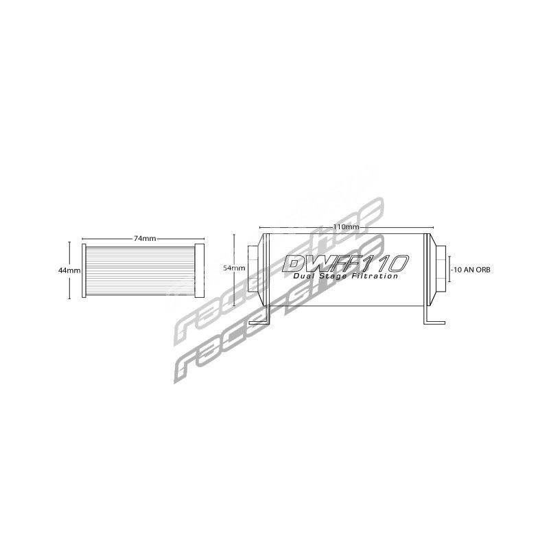 Its compact design (11 cm long, 5 cm diameter) and quality anodized aluminum finish make this fuel filter easy and pleasing to fit your vehicle. It connects with x2 AN8 ORB fittings and is very cleanly installed thanks to its mounting brackets.