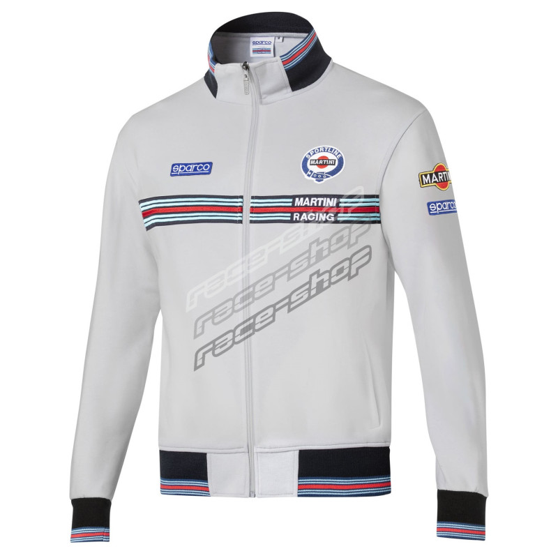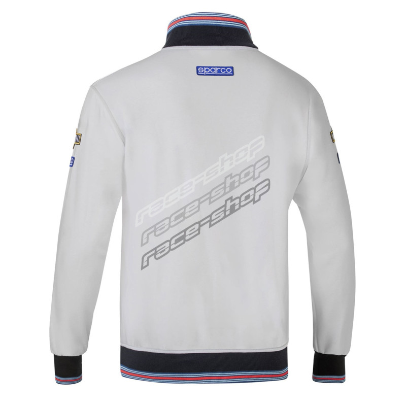 Zipped sweatshirt inspired by the iconic Sparco - Martini Racing combination. SPARCO and MARTINI RACING logo on the chest. Colorful detail on collar, cuffs and bottom of jacket.
